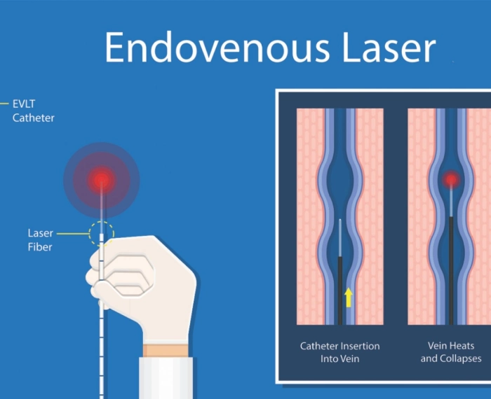 The endovenous (inside the vein) laser method is a minimally invasive procedure that is performed for larger varicose veins. In this procedure, a laser fiber is guided into the vein till it reaches the affected area. The fiber then emits a laser which produces heat and forms blood clots in the vessel. This blood vessel gradually shrinks and disappears. This is an outpatient procedure and takes about 30 minutes.